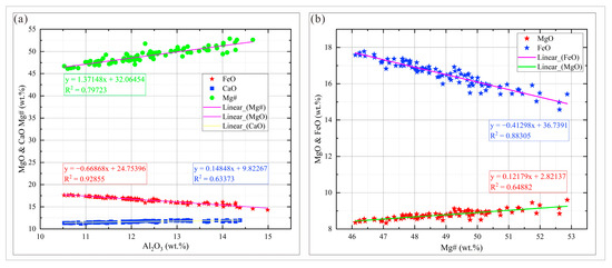 The lunar magma ocean (LMO) [104] hypothesis postulates that, during the solidification of magma oceans, olivine crystallizes first. Owing to its higher density, olivine tends to descend towards the bottom of the magma ocean during crystallization and differentiation. In contrast, orthopyroxene, with a relatively lower density, may undergo upward movement during differentiation, thereby completing the crust–mantle differentiation on the Moon. Our research findings suggest a slight increase in olivine content with the age of basalt, while orthopyroxene exhibits a slight decrease with basalt age. Consequently, we hypothesize that young lunar basalts in the Oceanus Procellarum region may have originated from partial magma upwelling induced by mantle thermal flux, predominantly emanating from the deep lunar mantle. This outcome aligns with the lunar magma ocean hypothesis. The LMO hypothesis posits that plagioclase and clinopyroxene are pivotal minerals in the lunar highlands. The lunar mantle is enriched in olivine, with aluminum being abundant in orthopyroxene, calcium in anorthite, and magnesium in olivine. Therefore, The Al2O3 abundance in mare basalts from the Oceanus Procellarum region is positively correlated with CaO abundance and Mg# but negatively correlated with MgO abundance (Figure 10a). Mg# is directly related to MgO abundance and inversely related to FeO abundance (Figure 10b). Therefore, In the oldest mare basalt units of the Oceanus Procellarum region, the TiO2, FeO, and olivine contents can reach 0.83 wt.%, 12.99 wt.%, and 17.59 wt.%, respectively. The CaO content reaches 12.84 wt.%. In the youngest mare basalt units, the TiO2 content can reach 3.69 wt.%, the FeO content can reach 16.93 wt.%, the olivine content can reach 18.39 wt.%, and the CaO content can reach 11.41 wt.%.