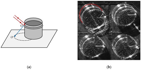 (1) As shown in Figure 3a, the maintenance walkway atop the oil tank forms a dihedral structure with the outer wall of the oil tank, resulting in the formation of an arc-shaped bright line in the image. It is marked with a red line in Figure 3b, which is a real scattering center. According to the principle of range-Doppler imaging of SAR, when radar observes, the target with the same distance and the same angle to the radar is projected to the same position. An equidistant line is marked by a blue line in Figure 3a. The point in Figure 3a will be projected to the position of in the image. Points at other locations will also be projected onto the ground plane based on the same principle, so they form an arc in the image. The target structure shown in Figure 3a is close to the radar and is located at the near end of the distance during imaging.