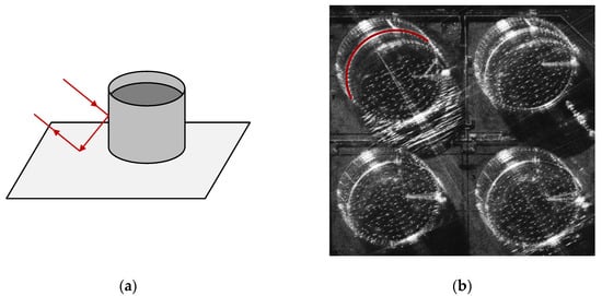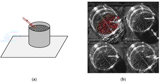 (5) As illustrated in Figure 7a, the vent valves positioned above the circular top cover manifest as small cylindrical structures, forming a dihedral corner reflector with the surface of the top cover. They appear as bright spots in the image, marked as red points in Figure 7b, which are real scattering centers. Due to the obstruction of the proximal barrel wall, the vent valve in the proximal part cannot be observed; that is, the part to the left of the green dotted line in the figure. As the oil storage volume decreases, the unobservable area of the top cover becomes larger.