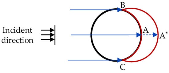 (6) When there is less oil stored in the tank, the radar signal has more complex multiple reflections in the oil tank. In [], SBR was used to simulate multipath scattering in oil tank SAR images. The principal multipath propagation path within the oil tank is illustrated in Figure 8a. It is evident that the electromagnetic wave signal undergoes multiple reflections between the inner wall and the floating roof. As illustrated in Figure 9, when the tangent direction of the reflection point is perpendicular to the incident direction, as seen at point A, the multipath reflection path is the longest. The position of point A in SAR image is also farther, that is, the position of point A′. In contrast, the multipath paths at points B and C are shorter. Consequently, the resulting multipath ghost image in the figure exhibits a moon-shaped pattern, highlighted in the red area in Figure 8b. This particular type of multipath ghost image possesses considerable energy and area, exerting potent interference on the image. Consequently, it becomes the focal point of suppression efforts in this study.
