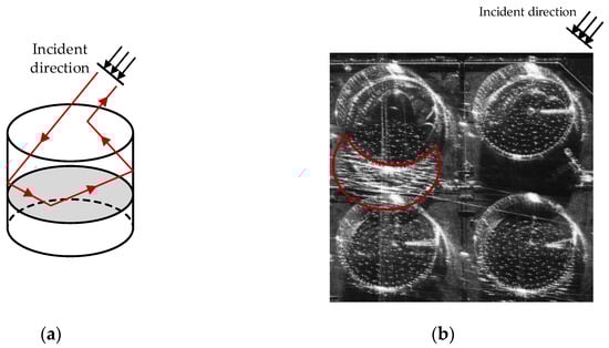 Multipath reflection between inner wall of oil tank and the floating roof. (a) Radar signal propagation path; (b) SAR image of oil tank.
