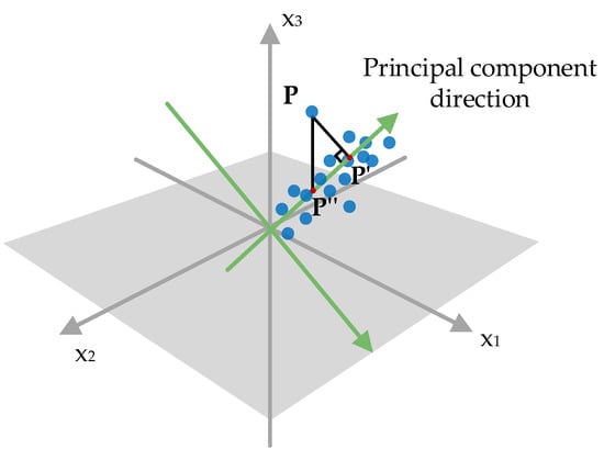 Here is an example to illustrate. The pixel point deviates from the stable value in the third sub-aperture image due to multipath interference, as shown in Figure 13. According to the principle of PCA, PCA obtains the direction of the data’s maximum variance by orthogonally decomposing; that is, the direction of the principal component. After orthogonal decomposition, the amplitude value of the pixel point is orthogonally projected to the principal component direction. The projection point is , but the ideal value is . Therefore, target energy loss and multipath signal residue will result from directly employing the PCA approach to orthogonally partition the data.