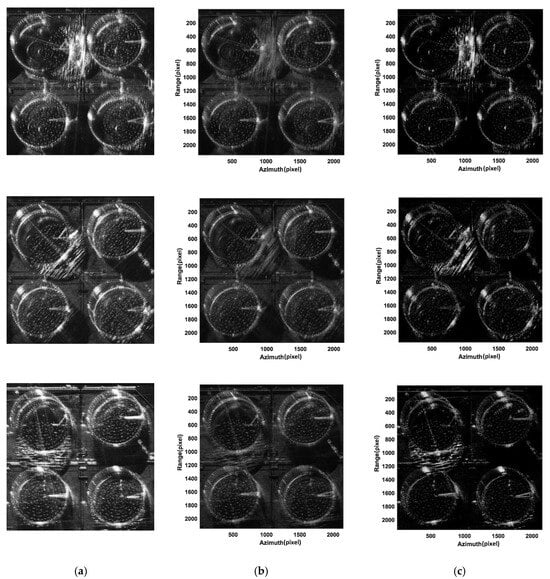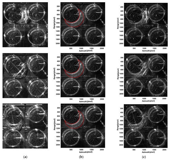 Figure 18 shows the results of RPCA decomposition. The parameter is set to 1.7. Three of the sub-images are shown in column (a), and the stable low-rank images with RPCA decomposition are shown in column (b). Although the majority of the multipath ghost images are suppressed, some multipath ghost images remain because of their enormous energy and large area. Sparse images obtained by RPCA decomposition are displayed in column (c), which extract the multipath signals that vary with the observation aspect.