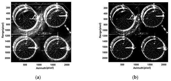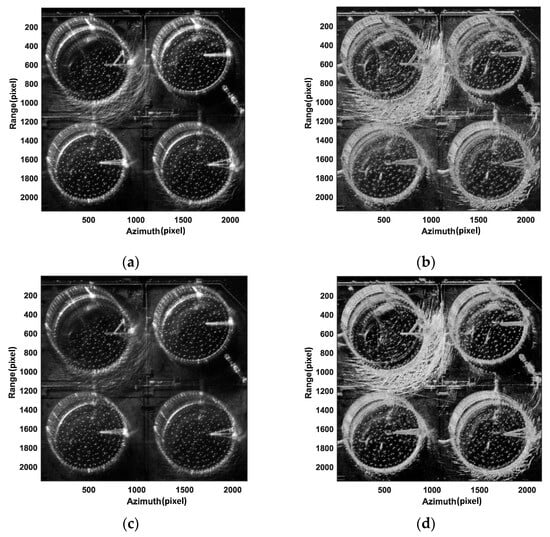 In order to verify the algorithm presented in this paper, we compare it with existing sub-aperture fusion methods. The sub-aperture fusion method proposed in [] first adds sequence images to create a full-aperture image. Next, the sub-aperture images of different aspects are dot-multiplied with the full-aperture image and then added. The processing result of the oil tank data is shown in Figure 21a. It is evident that the multipath ghost image was not effectively suppressed, and the information of the weak scattering area was lost. The sub-aperture double-layer fusion method proposed in [] adds a layer of fusion based on the original sub-aperture fusion method. This method first multiplies the sub-aperture images at different aspects with the full-aperture image to obtain the first layer fusion image. In the second layer fusion, the first layer sequence images are divided into multiple groups, and the images in different groups are correspondingly added to enhance the target image. The added images are then dot multiplied to suppress multipath ghost images. The result of processing the oil tank data with the sub-aperture double-layer fusion method is displayed in Figure 21b. The suppression effect of multipath ghost images is better than that of the single-layer sub-aperture fusion method. However, some multipath ghost images still remain and the information loss in weak scattering areas is more serious. Generally speaking, the sub-aperture fusion method can suppress the ghost image’s energy and increase the target’s energy. This is achieved by simultaneously increasing the pixel amplitude values of the target image and decreasing the pixel amplitude values of the multipath ghost image. But it cannot accurately identify the multipath ghost image and the real target. In the application context of this article, this type of method has a certain multipath suppression effect, but there are many multipath ghost images remaining, and the energy of the weak scattering region with stable scattering is lost.