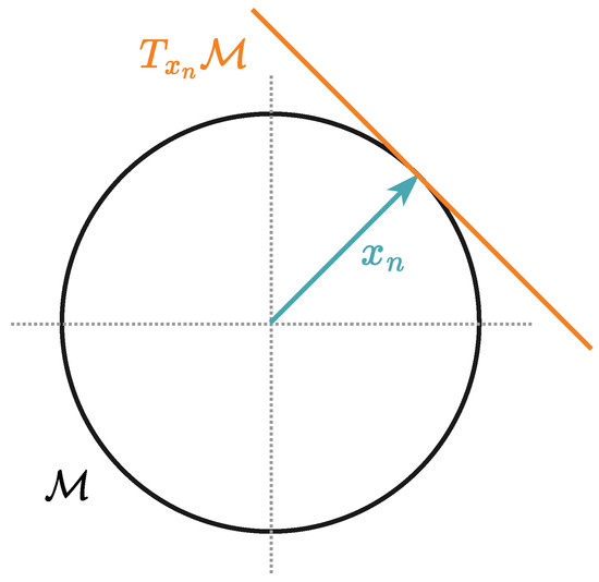 To establish Riemannian first-order methods, a preliminary concept of Riemannian gradients on smooth manifolds is essential. In this context, we exploit the fact that smooth manifolds can be locally linearized around the point to define the tangent space. The tangent space, denoted as , comprises all tangent vectors associated with curves at point [47], as illustrated in Figure 3. Then, the tangent space for CCM is given by