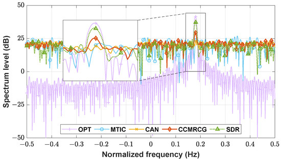The autocorrelation function and spectra of the devised waveforms are present in Figure 5 and Figure 6, respectively, when . Compared with the OPT waveform, the waveform based on CCMRCG shows improved performance in terms of autocorrelation sidelobes in spite of the sacrifice of spectrum match performance. Additionally, the CCMRCG-based waveform can produce a flatter spectrum outside of the OPT spectral peak, achieving a wider bandwidth and higher resolution. In contrast, while SDR can attain a waveform displaying superior spectral matching, this advantage is accompanied by a trade-off in terms of compromised sidelobe performance. Simultaneously, the waveform devised using MTIC exhibits a comparable manifestation to that of CCMRCG, which distinguishes itself through its non-constant modulus envelope.