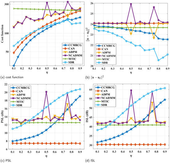 Figure 9 presents curves depicting different evaluation metrics in relation to . It is evident that when is small, the algorithm mainly focuses on optimizing the ISL of the waveform. As increases, there is a gradual shift towards attaching importance to target information. When , the cost function value of SDR is lower than that of CMMRCG. The reason is that SDR relaxes the rank-one constraint and uses the Gaussian randomization technique for exploring solutions within the feasible solution space. The higher the is, the closer to the designed sequence is, resulting in the reduction in the reliance on the ISL. Additionally, it seems that ADPM and NCADMM have no pronounced inclination towards target information with different compared to CCMRCG and SDR. This can be attributed to the modification of the update order of ADPM and NCADMM, which may lead to a bias towards maintaining the CMC rather than optimizing the objective function before achieving full convergence. This implies that the obtained sequence may not inherently contain updates pertaining to the target information from the objective function. This discrepancy also suggests that achieving convergence to a stationary point for these aforementioned methods may not necessarily be guaranteed under the condition of 2000 maximum iterations and the selected penalty coefficient. The presence of outliers on the curve of ADPM and NCADMM at and further substantiates our statements. Specially, the parameter values associated with the penalty coefficient need to be carefully chosen. However, as the primary focus of this paper does not revolve around ADPM and NCADMM, an extensive analysis was not conducted in this work; instead, they will be further discussed in ongoing research endeavors.