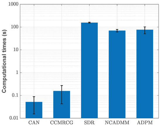 Global computational times (in seconds) for CAN, CCMRCG, SDR, NCADMM and ADPM. The maximum number of iterations is set to 2000 for CAN, CCMRCG, NCADMM and ADPM, while the maximum number of randomization is set to 2000 for SDR.