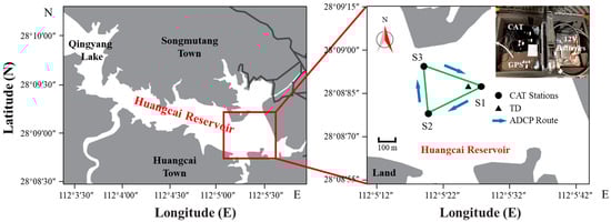 Geographical layout of the Huangcai Reservoir and its surrounding areas. The left panel provides an overview, while the right panel zooms in on the southeast portion of the reservoir. This detailed view highlights the locations of CAT stations (S1, S2, and S3), the TD point, and the trajectory of ADCP sailings. The green solid lines represent the projection of acoustic ray paths in the horizontal slice. Additionally, the upper right corner of the magnified figure features a photograph of the CAT system utilized at station S1.