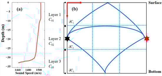Sound propagation structure and layer division. Two sound transceivers are deployed in the water and transmit sound reciprocally. Sound waves are reflected by the interface, where multi-path sound propagation is achieved. (a) Sound speed profile. (b) Corresponding acoustic rays.