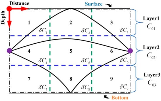 The approach employed to reconstruct the two-dimensional temperature field along a vertical slice is an extension of the layer-averaged water temperature reconstruction method. Analogously, the ray structure illustrated in Figure 3 is utilized in this methodology. Following the layer division, the eastward profile is segmented into three distinct sections. The vertical profile is further partitioned into three layers and arranged in a 3 × 3 grid configuration, as depicted in Figure 4. These layers and grids serve as the foundation for establishing the layer-averaged water temperatures and constructing the two-dimensional temperature field.