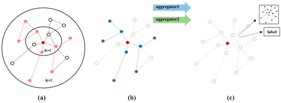 GraphSAGE [12] is a spatial graph convolutional network that leverages convolutional operations between nodes and their neighboring nodes to extract features from the neighboring nodes, as illustrated in Figure 5. Its main principle can be primarily delineated into two components: sampling and aggregation.