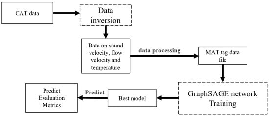 Initially, CAT data were acquired from the experimental apparatus. Subsequent to inversion procedures, fundamental data encompassing sound speed, flow velocity, and temperature were derived. Aligned with the experimental objectives, the emphasis was placed on temperature prediction within the region with sound speed prediction serving as a supplementary facet of the experiment. Due to the experimental data being acquired from acoustic tomography experiments conducted in Huangcai Reservoir, it is noteworthy that the salinity value within the lake remains constant at 0, exhibiting no variation with changing depths. The data underwent filtration using Matlab R2022b with the extraction of sound speed and temperature data constituting the dataset. Following time-series-based processing of the data, the dataset was partitioned into training, validation, and test sets in a ratio of 3:1:1. GraphSAGE was employed to predict the training data during the training phase. The resultant model was then utilized for feature extraction to forecast future temperature and sound speed. Comparative analysis of the predicted outcomes against the validation set facilitated the identification of an optimal model, culminating in its evaluation through metric assessments on the test set.