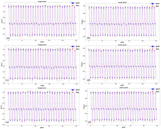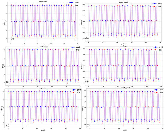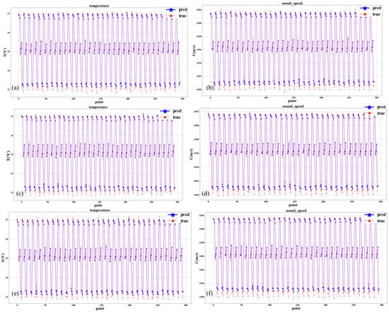 Temperature and sound speed prediction results of S1→S3. The blue line represents the predicted value and the red line represents the true value. (a) Results of the initial temperature prediction. (b) Results of the initial sound speed prediction. (c) Results of the second temperature prediction. (d) Results of the second sound speed prediction. (e) Results of the third temperature prediction. (f) Results of the third sound speed prediction.