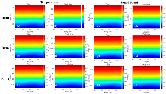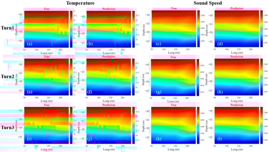Temperature and sound speed prediction results of S1→S3. (a) True data of the initial temperature. (b) Results of the initial temperature prediction. (c) True data of the initial sound speed. (d) Results of the initial sound speed prediction. (e) True data of the second temperature. (f) Results of the second temperature prediction. (g) True data of the second sound speed. (h) Results of the second sound speed prediction. (i) True data of the third temperature. (j) Results of the third temperature prediction. (k) True data of the third sound speed. (l) Results of the third sound speed prediction.