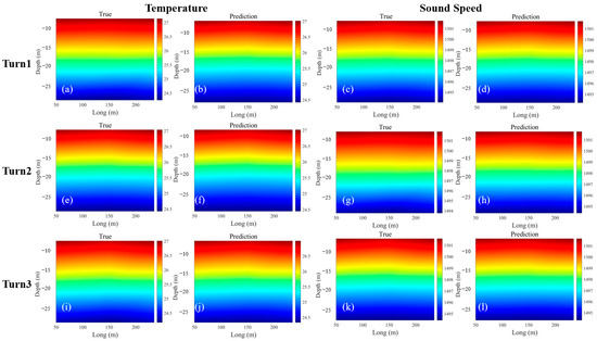 Temperature and sound speed prediction results of S2→S3. (a) True data of the initial temperature. (b) Results of the initial temperature prediction. (c) True data of the initial sound speed. (d) Results of the initial sound speed prediction. (e) True data of the second temperature. (f) Results of the second temperature prediction. (g) True data of the second sound speed. (h) Results of the second sound speed prediction. (i) True data of the third temperature. (j) Results of the third temperature prediction. (k) True data of the third sound speed. (l) Results of the third sound speed prediction.