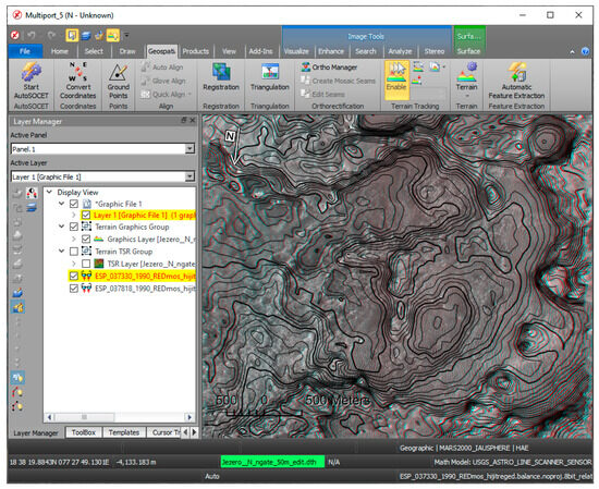 A screenshot of a SOCET GXP Multiport showing an anaglyph view for a HiRISE image stereo-pair (ESP_037330_1990, ESP_037818_1990, red channels) within the floor of Jezero crater (77.69°E, 18.41°N). 4 m interval contours are shown to highlight a visual representation for the stereo-derived DTM. While editing can be performed in this anaglyph mode, most workstations, specifically configured for DTM editing, will have a high-end Graphics Processing Unit (GPU) driving two Liquid Crystal Displays (LCDs) mounted on a specially designed stand. A passive polarized mirror bisects the two monitors allowing the user, who is wearing polarized eyeglasses, to view the left and right monitors separately. The SOCET GXP application, using the available rigorous camera model, provides dynamic adjustments to the left and right images, resulting in the perception of depth. This is how a user can visually verify the quality of the DTMs, point-by-point, and manually edit any poorly matched points (also called blunders).
