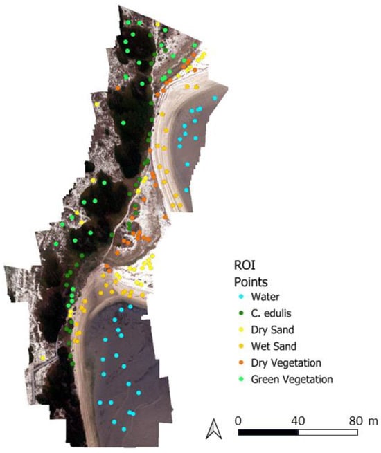 The number of cover classes was determined by the visual identification of the most relevant covers in the image, and 30 Regions of Interest (ROIs) of 20 × 20 cm2 were selected for each class for the training of the classification, resulting in approximately 13,000 pixels. For the target C. edulis class, the ROIs were created near to the vegetation sampling areas (Figure 3).