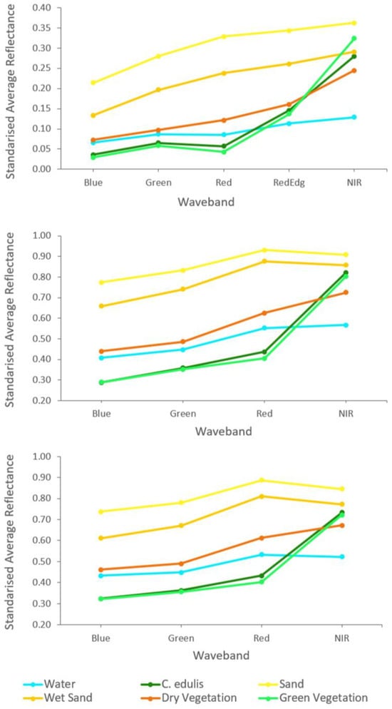 The six most relevant covers could be identified in the orthomosaic: water, C. edulis, sand, wet sand, dry vegetation, and green vegetation. The dry vegetation and green vegetation classes included all vegetation species in the study area that were not identified as C. edulis. The mean spectral signatures of the ROI training areas for each class and for the different image resolutions are displayed in Figure 6.