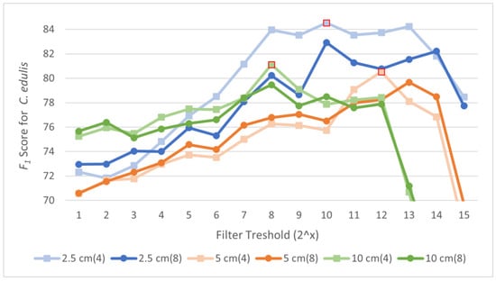 Comparison of F1 score for the C. edulis class for different filters (4: 4-pixel filter; 8: 8-pixel filter), thresholds, and resolutions. Highest F1 score marked in red.