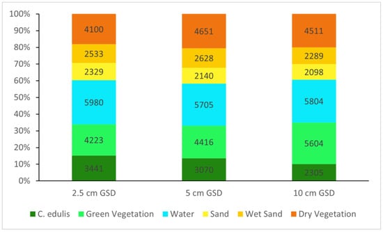 The different resolution images resulted in classifications with different cover class distributions (Figure 8), with varying proportions, particularly for the of-target class C. edulis and for the green vegetation.