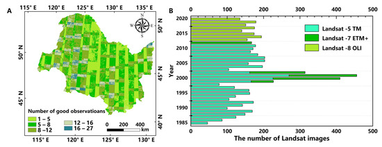 Spatial distribution and the number of good observations across the CARB in 2020 by Landsat-8 OLI (A) and number of Landsat images used in the study (B).
