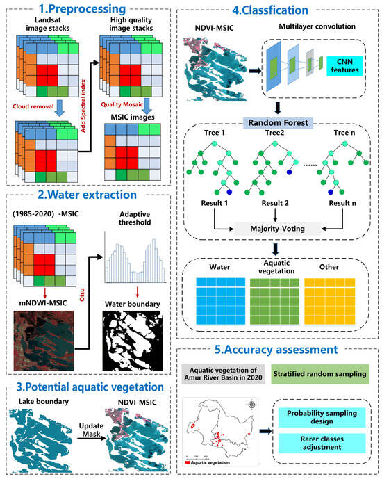 In this study, we proposed a high-precision and robust classification method for extracting aquatic vegetation The CNN-RF classification method used in this paper has higher accuracy and can quickly process a large amount of data at one time, achieving efficient classification and greater robustness compared to CNN and RF alone. The basic idea involves employing an image composite to construct spatially and spectrally uniform images. We composed the maximum mNDWI index and extracted the water surface area using Otsu binary segmentation. Only lakes with an area larger than 20 km2 were considered in this paper. The mask extracts the maximum NDVI composite image to identify potential aquatic vegetation areas. The resulting maximum NDVI composite image is then inputted into the CNN model to extract features. Subsequently, these features are fed into the RF classifier for accurate classification, enabling the precise mapping of the spatial and temporal distribution of aquatic vegetation from 1985 to 2020. According to the accuracy assessment, all the maps in the dataset exhibit high producer and user accuracy. Water surface and aquatic vegetation areas larger than 20 km2 in the CARB show an overall decreasing trend from 1985 to 2020, reducing from 3575 km2 and 745 km2 to 3412 km2 and 687 km2, respectively. Among them, the water area of Hulun Lake exhibits a decreasing trend, while the water areas of Chagan Lake and Xiaoxingkai Lake are relatively stable. The water area of Lianhuan Lake exhibits an initial decrease and then increases. In terms of aquatic vegetation, the area in Lianhuan Lake remains relatively stable. However, in Hulun Lake, the aquatic vegetation area shows an initial increase, then decreases significantly, and then fluctuates and rises. Chagan Lake’s aquatic vegetation area fluctuates and then rises slowly, and Xiaoxingkai Lake’s aquatic vegetation area fluctuates and then continues to decline. The proposed method for aquatic vegetation information extraction in this paper not only extends the spatial portability of the model but also provides a powerful method and theoretical support for future extraction and monitoring of aquatic vegetation. The dataset of aquatic vegetation is invaluable for creating historical background maps of aquatic vegetation and evaluating the habitats of aquatic organisms, including their applicability to various species. In this study, an intriguing question emerges: can we further optimize the RF model to enhance interpretability when extracting aquatic vegetation from lakes using the CNN-RF approach? Additionally, future work will involve the development of a Landsat calibration model using high-resolution images. This calibration model aims to refine Landsat satellite-derived aquatic vegetation images, enabling a long-term series of fine classifications for various aquatic vegetation groups.