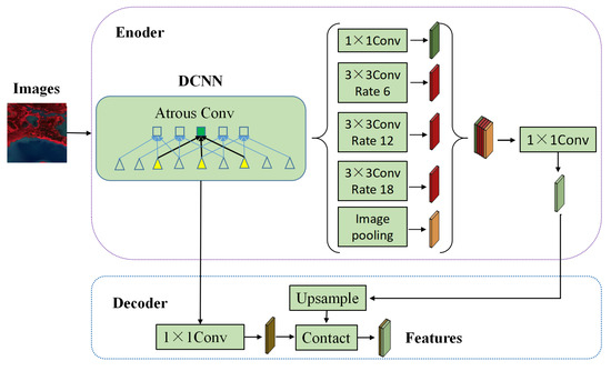 The CNN structure adopted in this study is shown in Figure 4. The network structure of DeepPlabv 3+ is used to extract features [38]. The model is trained with labeled data sets. The main body of its encoder is the DCNN feature extraction network with atrous convolution, and the Xception_65 network structure and Xception_71 network structure are selected. DeepPlabv3+ introduces atrous spatial pyramid pooling (ASPP) to fuse context information at different scales. The ASPP module includes several parallel branches of atrous convolution. Each branch has a different dilation rate. In this way, rich contextual information can be captured at different scales and fused into the segmentation results. The decoder fuses the features of the bottom layer and the top layer by techniques such as upsampling and skip connections, and the extracted CNN features are used as the input of the random forest classifier.