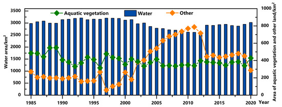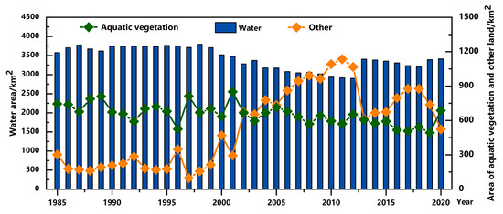 The changes in the main lakes (Hulun Lake, Lianhuan Lake, Chagan Lake and Xiaoxingkai Lake) are shown in Figure 6. Aquatic vegetation showed a slight decreasing trend from 1985 to 1987, from 486 km2 to 485 km2, and began to increase in 1988. In 1989, the aquatic vegetation was relatively stable, with an area of 549 km2, and then it showed a decreasing trend. In 1992, aquatic vegetation area was 332 km2, and during 1992–1996 it showed a fluctuating trend. In 1996, the aquatic vegetation area was 315 km2, and this increased to 477 km2 in 1997. From 1997 to 2006, aquatic vegetation fluctuated in a small range. In 2006, the aquatic vegetation area was 340 km2, and during 2006–2020, the area of aquatic vegetation was relatively stable. In 2020, the area of aquatic vegetation was 428 km2. Overall, the change trend of water surface and other land in these four typical lakes is close to that in all the lakes as a whole.