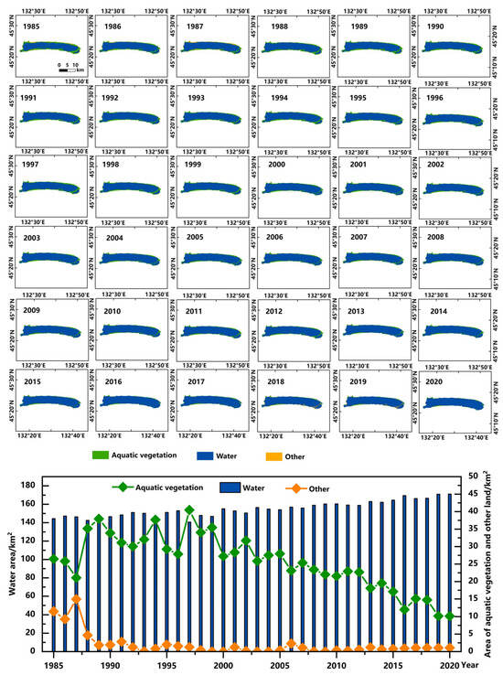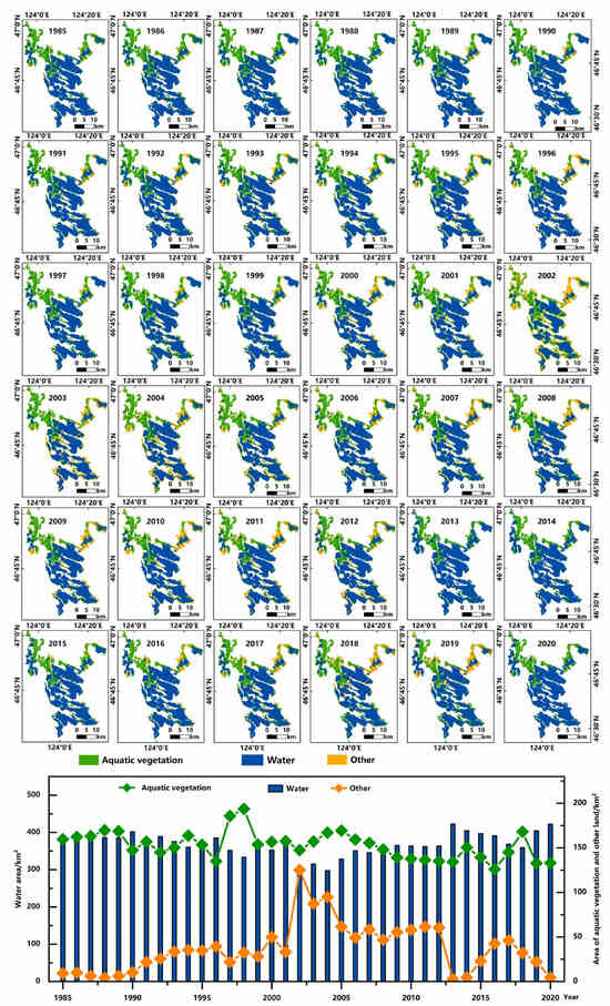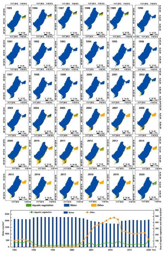 Spatial and temporal distribution and area changes of aquatic vegetation and water of Hulun Lake from 1985 to 2020.