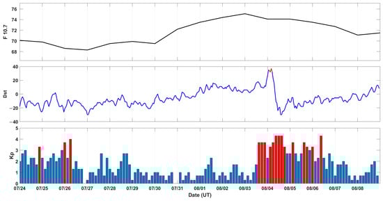 Based on the findings of statistical research on ionospheric plasma parameters associated with seismic disturbances [,,,], it has been found that anomalies predominantly arise within a two-week timeframe prior to earthquakes, with the highest frequency of anomalies occurring within the final week before the seismic event. As a consequence, our primary focus was directed towards the investigation of ionospheric disturbances 15 days before the Jiuzhaigou earthquake. Initially, several indices are employed to establish a comprehensive understanding of the pre-earthquake ionospheric spatial environment before engaging in data analysis, aiming to discern it from the effects of space weather activity on the ionosphere. Figure 1 presents the relevant indices describing the spatial weather activity from 24 July to 8 August 2017, including the solar flux at 10.7 cm (F10.7), Dst, and Kp indices. It can be seen that the solar activity was relatively calm during the study period. According to some Kp indices greater than 3 and Dst indices close to −30 nT on 24–26 July, it was indicated that there was a weak magnetic storm event. On 3–6 August, the Kp indices increased significantly, and the Dst indices showed that there was a clear onset phase of magnetic storms on 4 August with a minimum of −37 nT, and then the magnetic storm entered the recovery phase. Overall, the ionospheric spatial environment was relatively calm from 27 July to 2 August and on the days immediately before the earthquake on 7 and 8 August.