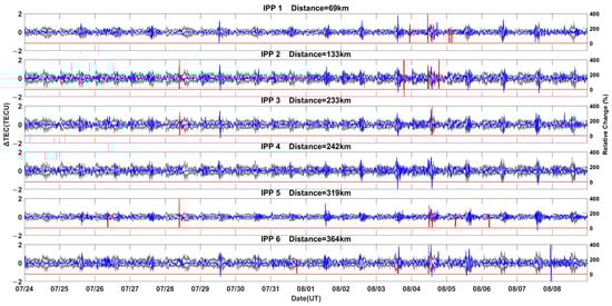 Time–frequency plots of TEC at the six IPPs in Figure 7.