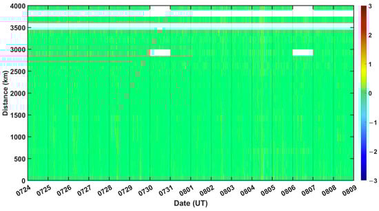 Attempting to study the spatial characteristics of TEC pre-earthquake disturbances, we further analyzed the time variation of disturbances in terms of their distance from the epicenter. The distance between each IPP and the epicenter was calculated using TEC observations taken every 30 s, which were graphed with the time and distance at a resolution of 150 km. The distribution of IPPs is uneven, which may result in the absence of data within certain distance ranges and affect the analysis results. The analysis revealed that the TEC data existed at each distance, as shown in Figure 4. By setting upper and lower thresholds as M ± 1.5IQR, the anomalous TEC data were highlighted over time and distance (Figure 5). The pictures in the abnormal days mentioned in the former illustration were enlarged and are displayed in Figure 5 for better visualization.