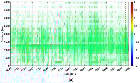 TEC variation with the date (X axis) and distance from the epicenter (Y axis). The red dashed line represents the time of the earthquake. The dates of panels (a–d) are 24 July to 8 August, 28 July to 29 July, 2 August to 2 August, and 7 August to 8 August.