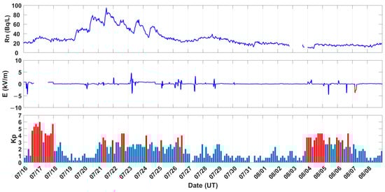 The variation of radon gas, atmospheric electric field, and Kp from 16 July to 8 August 2017. (When the datum is below −1 kV/m and lasts for more than 2 h, it is displayed as a red curve in the temporal variation graph of the atmospheric electric field; in the panel of Kp, the red bar denotes indices greater than 3).