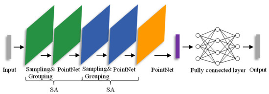 The PointNet++ deep learning network model is developed based on the PointNet network. PointNet utilizes a multi-layer perceptron to extract feature information from point clouds and uses a max pooling layer to extract global features for classification. Although the PointNet network pioneered point cloud processing, it cannot capture the local features of points, and it lacks the ability to analyze point clouds at a finer granularity and generalize well with complex sample data. To address these limitations, the Qi team introduced a hierarchical point set feature learning structure, employing farthest point sampling (FPS) [39] for sampling and designing two “adaptive” solutions for dense and sparse point clouds. This ensures that the sampled points cover the entire sampling space, resolving the issue of uneven point cloud density and achieving end-to-end automated point cloud classification. The structure of the PointNet++ classification network is illustrated in Figure 1.