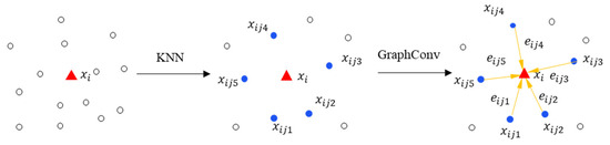 The GraphConv module aggregates its features through graph convolution, combining the feature vectors of each node and its neighboring nodes in a nonlinear way. This non-linear combination enhances the comprehensive local neighborhood information, strengthening the feature-capturing capabilities. The specific approach involves constructing a directed graph using the K-nearest neighbors (KNN) [40] algorithm, where represents vertices, , is the number of point clouds, and E represents edges formed by KNN. Taking k = 5 as an example, Figure 2 illustrates the feature extraction process of graph convolution. For a selected node , the KNN algorithm selects the five nearest neighboring points {, , , , }. The distances between node and its neighboring points form the edges of the graph, represented by the yellow directional lines in Figure 2, and represents the edge features between node and its neighboring points. Its feature aggregation can be formally represented as Equations (1) and (2).