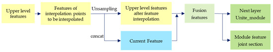 The purpose of the Unite_module is to take the features from the upper layer, which contains fewer points but richer semantic information, and attach them to the features of the current layer through a feature upsampling process. This enriches the semantic information of the current layer. The upsampling network architecture can be divided into four categories: pre-upsampling, post-upsampling, stepwise upsampling, and iterative upsampling. In this paper, the pre-upsampling method is employed, which can use interpolation of any size and scale factor compared to other methods, and its learning difficulty is also lower. Figure 3 illustrates the structure of the Unite_module. From Figure 3, it can be observed that the features from the upper layer first undergo an upsampling transformation and are then concatenated with the features of the current layer. Finally, the fused features pass through a multi-layer perceptron (MLP) to produce the output. The new features have two paths: one directly enters the final step, and the other serves as the input for the next Unite_module in the next layer.
