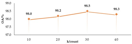 The feature extraction performance of graph convolution depends on the number of k-nearest neighbors. To assess the impact of different k-values on the network’s performance, a comparison of classification accuracy was conducted for various k-values, as shown in Figure 11.