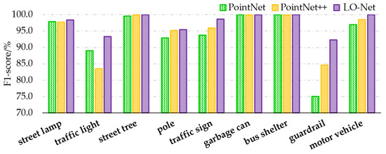 As for the F1 values in Table 5, which offer a more comprehensive reflection of single-sample classification performance, the results for different land cover types are as follows: road lamps achieved an F1 score of 98.4%, traffic signal lamps scored 93.3%, road trees scored 100%, line poles scored 95.4%, traffic signs scored 98.6%, garbage bins scored 100%, bus stops scored 100%, guardrails scored 92.3%, and motor vehicles scored 100%. Compared to the PointNet and PointNet++ networks, all samples showed higher F1 values, indicating improved classification performance for individual samples. Analyzing the characteristics of each land cover sample individually, as can be seen from the bar chart in Figure 12, it becomes clear that road trees, garbage bins, bus stops, and motor vehicles have relatively simple and distinct shapes, resulting in high F1 scores, all achieving 100% classification F1 values in the LO-Net network. Road lamps rely on their arms or single-arm lamp heads to distinguish themselves from other samples, achieving a 98.4% F1 score. Traffic signs come in multiple varieties, but their head components exhibit distinctive cubic features, contributing to a 98.6% result. Line poles can be either long and straight or have protruding features, which sometimes resemble sparse or incomplete pole-like land features, resulting in a 95.4% F1 score. Traffic signal lamps have diverse types, including cameras, pedestrian crossing signal lamps, intersection signal lamps, and central road signal lamps, which exhibit various shapes. Guardrails are long and straight with multiple protruding structures, making them susceptible to misclassification as traffic signal lamps or line poles, and there are fewer instances of this sample compared to others. Consequently, traffic signal lamps and guardrails achieved the lowest F1 scores.