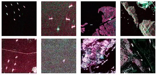 Pseudo-color SAR images from the DSSDD dataset in azimuth ambiguity, multi-target areas, breakwaters, and inshore scenes.