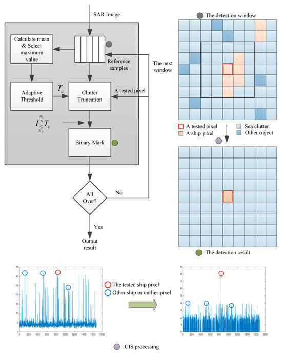 Figure 2 shows the CIS detection flowchart and some detection details. CIS detection contains two main parts: (1) adaptive detection threshold estimation using simple calculations, such as the standard deviation, mean, maximum intensity, and adjustment depth, and (2) the detection rule. After a comparison with the adaptive threshold, the tested pixel is determined as a ship pixel or a clutter. After all the pixels are examined, a binary image containing ship targets only is the output.