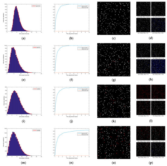 Figure 7a,e,i,m show the histogram statistics of the four clutter-simulated samples. The fitting results are consistent with the four preset models. Figure 7b,f,j,n exhibit the performance of CIS detection under different λ for different clutter statistical models. The PD becomes stable and high when λ is close to 3, 4, or 5, but the FAR also appears when λ > 3. In summary, considering a high PD and a relatively lower FAR under different clutter statistical models, the statistical optimal adjustment factor of 3.0 is selected. Figure 7c,d,g,h,k,l,o,p show the CIS detection results, which, for λ = 3.0, have higher PDs (white pixels) and lower FARs (blue pixels) than the reference methods.