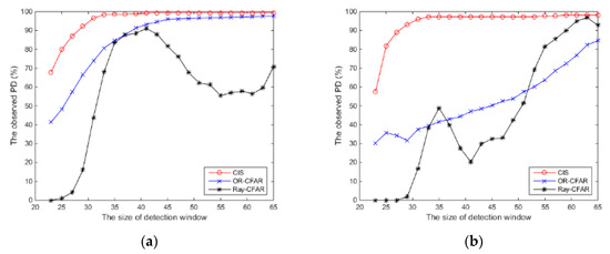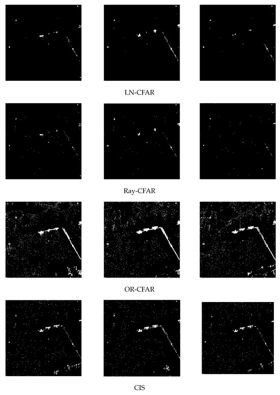 Figure 10 shows the experimental results of CIS, OR-CFAR, and Ray-CFAR detection against Figure 3a and Figure 5a. The range of the size of the detection window is from 23 to 65 pixels with a step of 2.