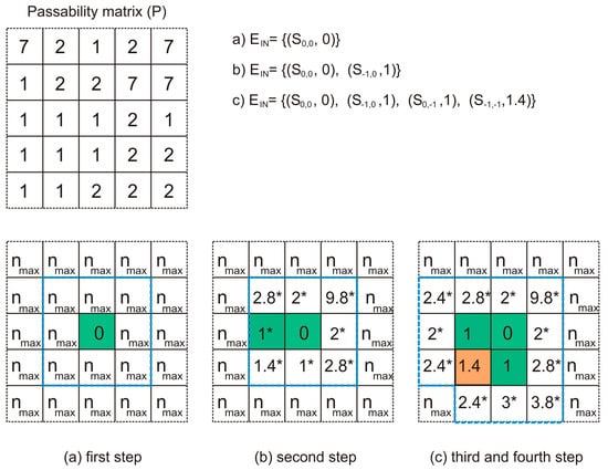 Initially, all segment values except the segment with IPP (S0,0) within the smax radius are set to nmax. Also, a list (Ein) is formed in which all the segments for which the relative distance n to the starting point (IPP) is calculated are included. In the beginning, only the initial segment (IPP) with the value n = 0 was in the list.