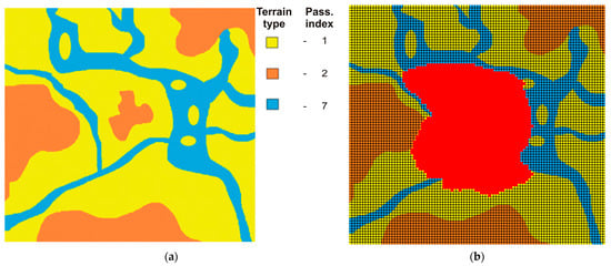 In order to test the performance of the PMA algorithm, the first test was performed on a computer-generated map (Figure 3a). The generated terrain image contained three types of terrain. It can be noticed that the water surface (river), in this case, was assigned a passability value of 7 and not the maximum 10 because it was estimated to not be impassable after all. The area was divided into 100,000 (100 × 100) segments. The resulting area after area expansion (PMA algorithm) is presented in Figure 3b.
