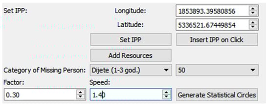 To define the necessary input data in the PMA algorithm, it was necessary to determine the search area. We defined the area by setting the IPP, the type of person being sought, the estimated speed of movement, the percentage of the statistical curve from the ISRID database, and an additional heuristic factor for correcting the maximum speed of movement (Figure 6).