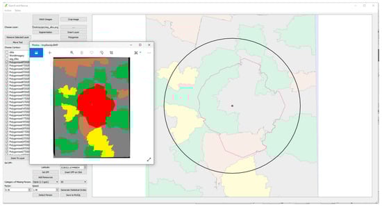 The next step is shown in Figure 5. The terrain segmentation script that uses the mean shift algorithm is started, and the result is a set of polygons. Each polygon represents a different type of terrain. The color of the polygon suggests what type of terrain it is (brown—agricultural land, green—dense forest, gray—low vegetation, yellow—urban area).