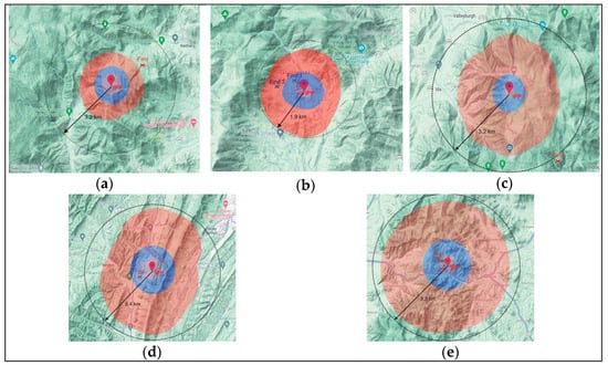 Finally, the PMA algorithm was tested on examples of real cases available from the literature []. For the five cases in which the IPP point, the location of the find, and the type of person being searched for are known, the search areas generated by the PMA algorithm are drawn. As the search start time is usually much later than the moment when the person was last seen, the theoretical maximum distance that the missing person could travel would make the potential search area very large. Therefore, in the examples shown in Figure 8, the ISRID statistical circle value of 75% probability for the type of missing person was taken for the maximum distance that the missing person could travel (smax). Also, for better visualization, the calculated areas corresponding to distances of 25% and 50% are marked.