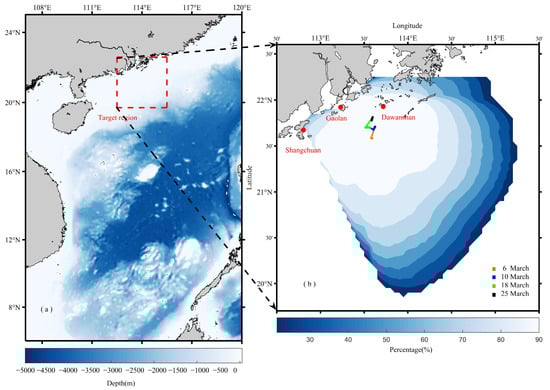 (a) Location of the study area; (b) temporal coverage percentage of the valid observations at the observed area, location of the high-frequency surface wave radar stations (red dots), and trajectories of the underway measurements on 6 March (orange squares), 10 March (blue squares), 18 March (green squares), and 25 March (black squares), respectively.